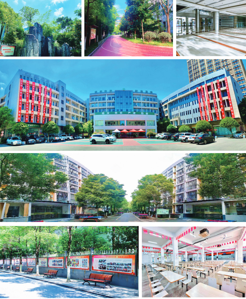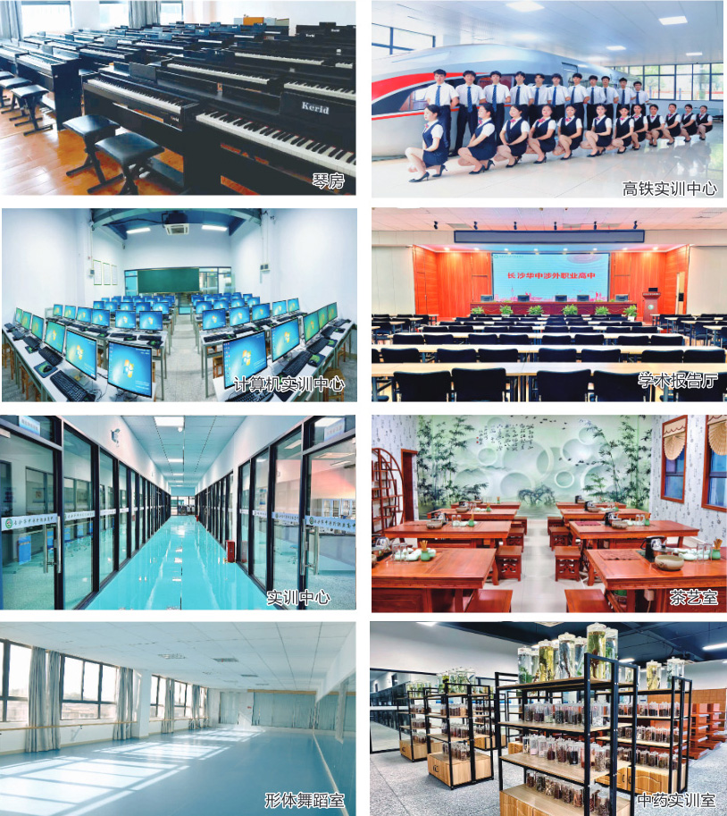 学校拥有近 10 万平米的教学楼和实训楼,拥有先进完备的教学设施设备:计算机实训室、会计实训室、形体舞蹈室、幼儿实训室、音乐钢琴房、高铁实训中心、平面设计实训室、茶艺室、画室、旅游实训室、中药实训室、学术报告厅、图书室等。